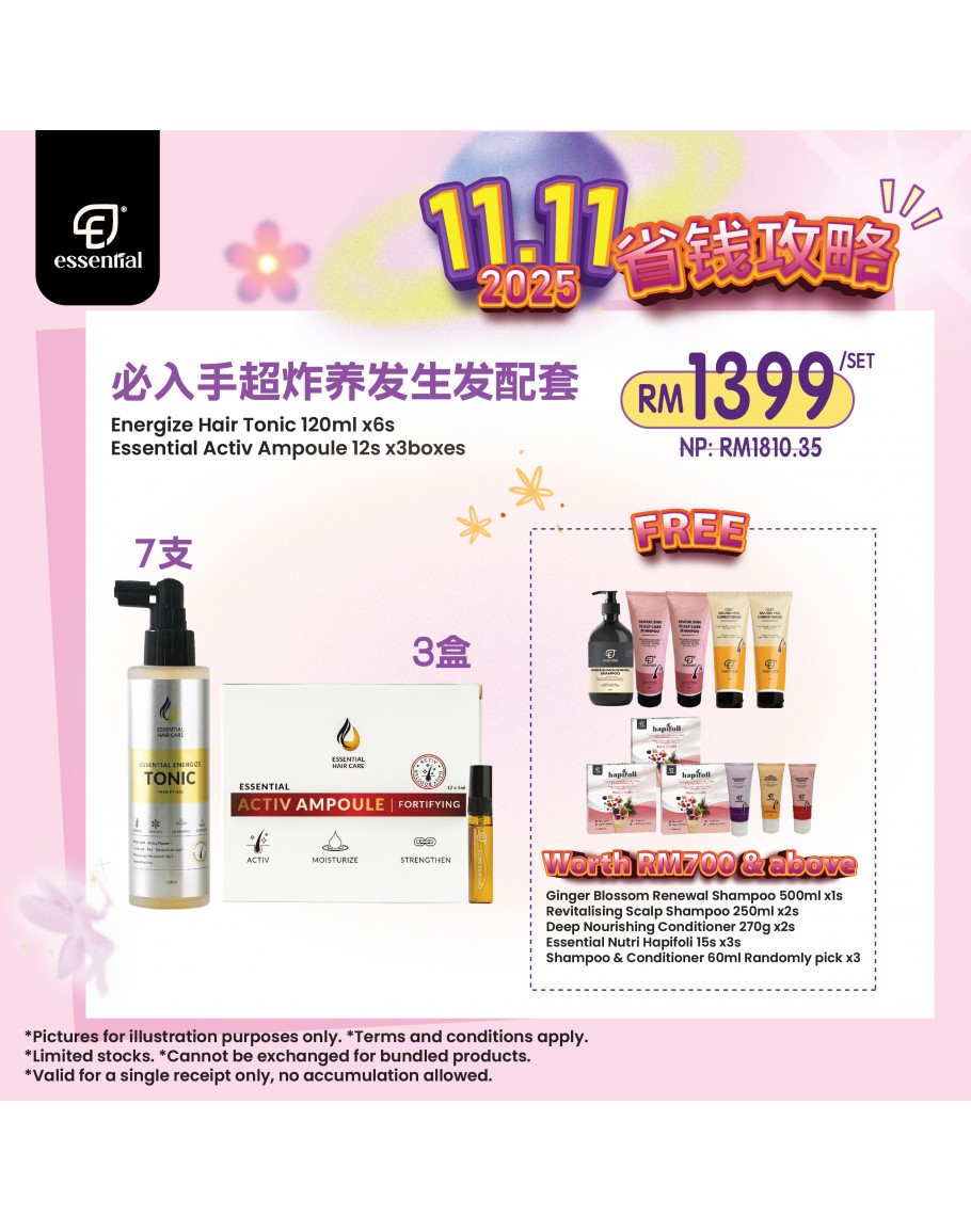Essential 11.11【必入手超炸養髮生髮配套 : 6x Tonic 120ml + Activ Ampoule 12s x3 boxes + FREE gifts 價值RM700+ 請看圖】(1-3天發貨)